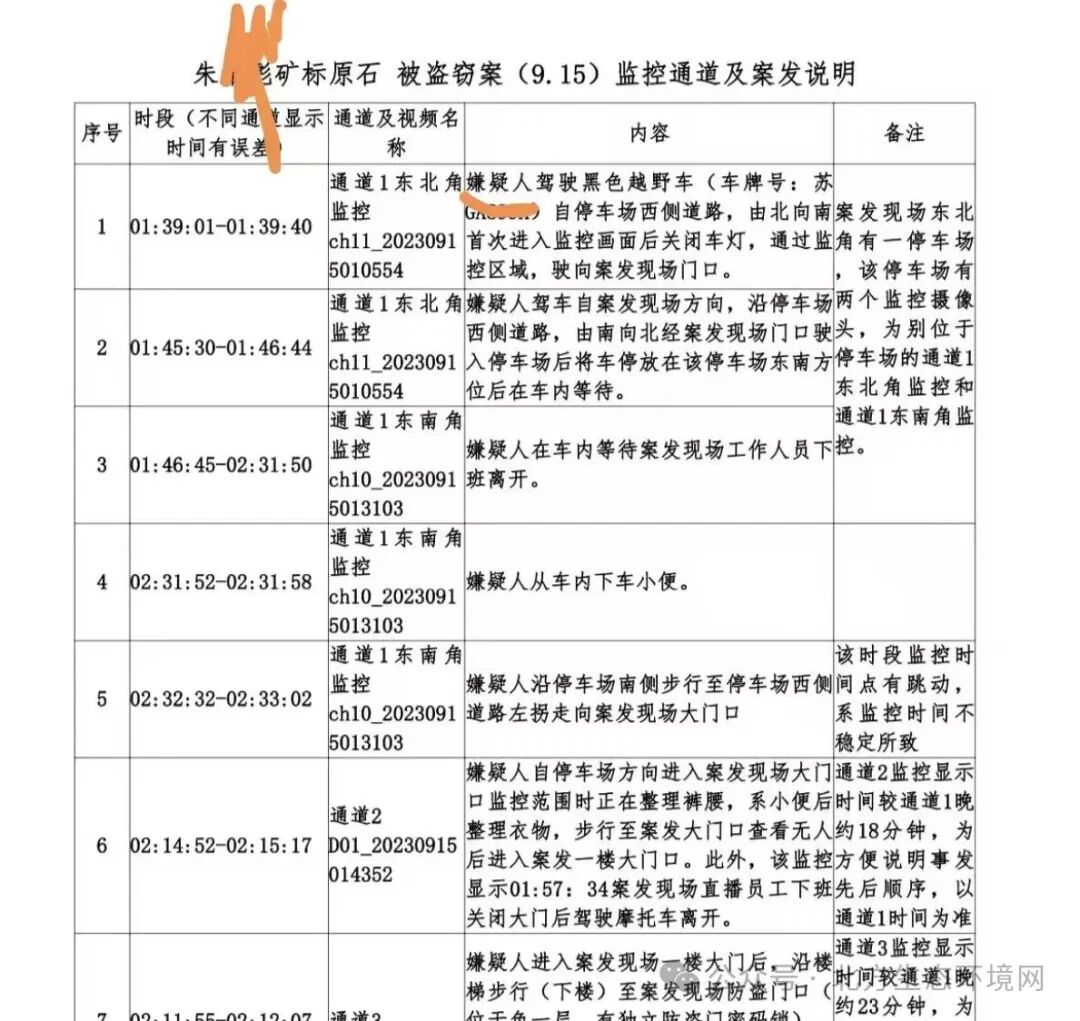 2023年9月15日早上8点,朱伟报警直播间矿标原石被盗,朱某芸团伙作案。